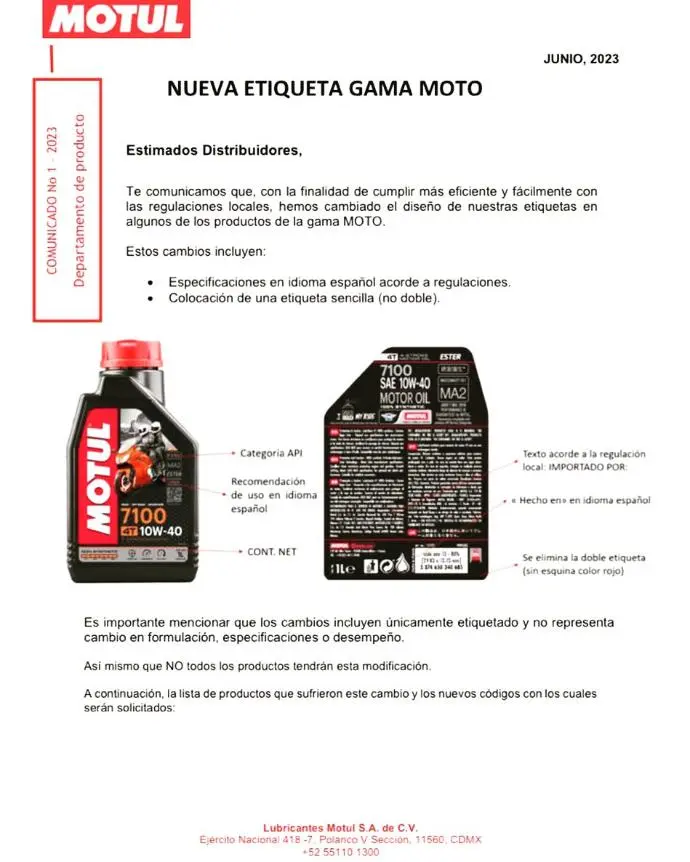 No obstante, desean aclarar que esta percepción es errónea. El cambio en el etiquetado fue anunciado oficialmente por Motul México en sus canales oficiales y a través de un comunicado proporcionado a todos los distribuidores de la marca.
